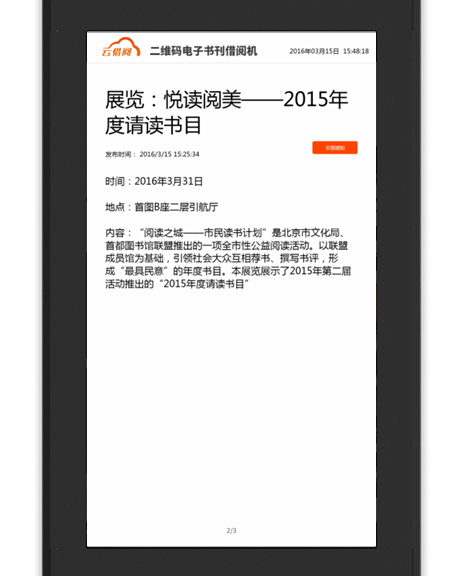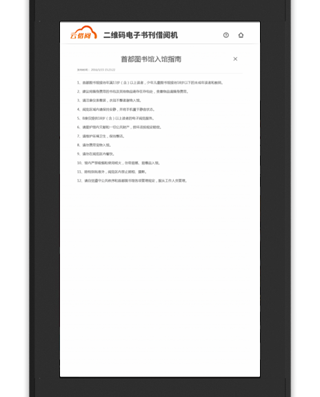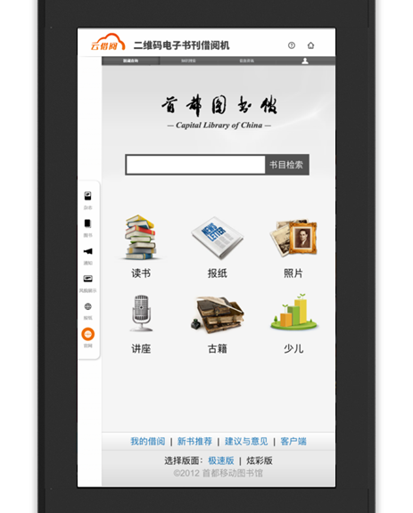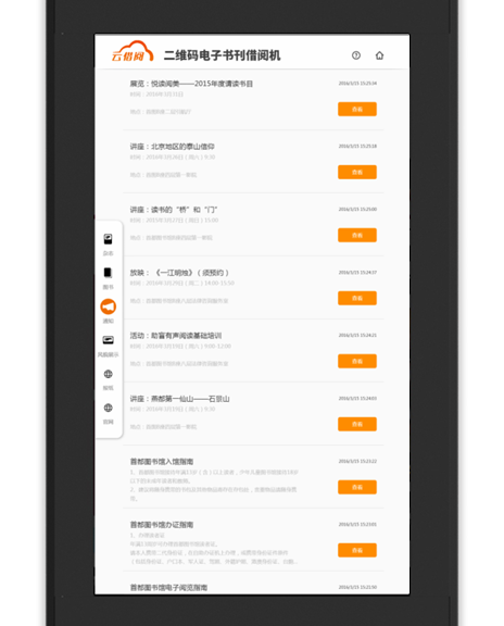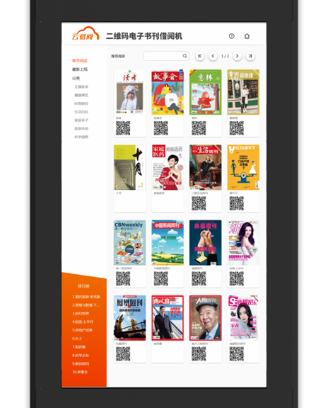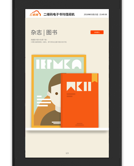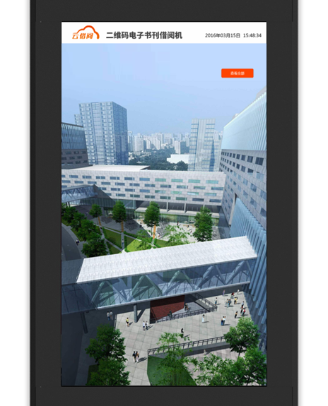 “云借阅”通过先进的二维码借阅技术,将2000册正规电子图书与多本群众喜闻乐见的杂志,通过触摸屏及各自手中的智能手机,一点、一扫、一借即实现多区域的阅读服务与借阅服务。即一台机器可服务于千、万,充分满足了读者的阅读需求,创造全民阅读的氛围。