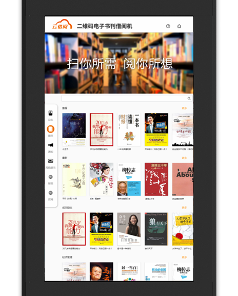 “云借阅”适用于图书馆、公交枢纽、地铁站、文化社区、企业、学校等,可作为机构/社区的24小时数字图书馆,也可独立部署,以低成本为更多人群提供服务。