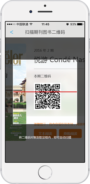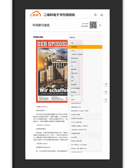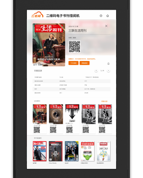 书刊详情:用户点击想要阅读的书刊封皮,来到书刊详情页,这里包含了书刊简介、目录以及过往期刊,使用手机扫描二维码即可直接下载到手机,点击文本/原貌阅读按钮亦可直接阅读。