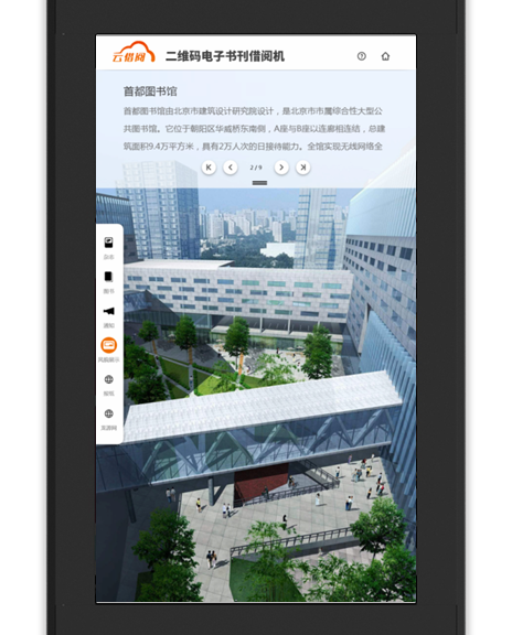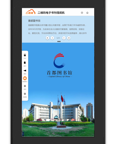 1. 屏幕保护:屏保页面将为您呈现图书杂志、机构风貌、通知等内容,当无人使用时便会滚动轮播展示,点击右上角按钮进入“云借阅”。