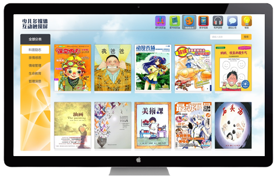 少儿多媒体互动触摸屏是感创科技面向公共图书馆少儿馆及幼儿园平台推出的智能多媒体触摸屏,为广大用户提供最易于使用的数字化综合阅读管理平台。图书馆及幼儿园可以通过购买感创少儿多媒体互动触摸屏,为小读者们提供最轻松愉悦的数字化阅读服务。