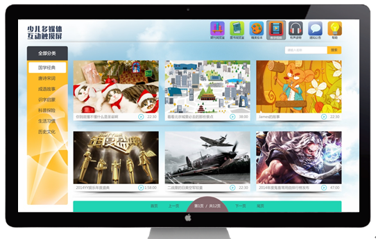 它简单智能、易于使用,既可放置于馆内、园内公共场所,由小读者们自行体验、自主学习,也同样适用于电子阅览室、计算机室等处,作为电教化阅读、教学的重要组成部分,为大家持久地服务。少儿多媒体互动触摸屏包括:
