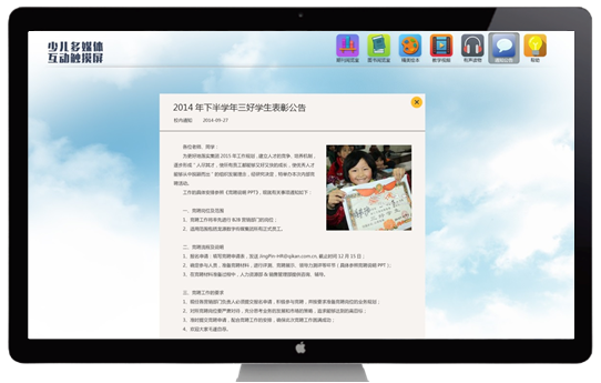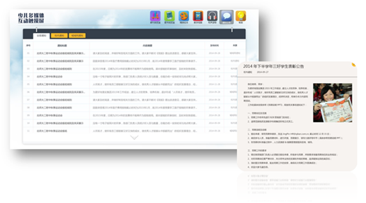 除了学习内容外,少儿多媒体互动触摸屏还为图书馆及幼儿园提供了公告模块,结合感创所提供的后台管理系统,可随时发布通知信息,该信息会在界面首页滚动播放,点击亦可浏览详细内容。
